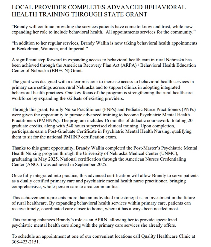 Brandy Wallin in addition to her regular services is now taking appointments for behavioral health appointments in Benkelman, Wauneta and Imperial.